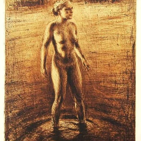 Et vakkert grafisk trykk av den anerkjente norske kunstneren Bjørn Algrim. "Bare en igjen" viser en enslig figur som ser ut over et blått farget vann, en detalj som gjør dette A.P.-trykket ekstra unikt. A.P. (Artist's Proof)-trykkene er kjent for å ha små, eksperimentelle forskjeller fra de nummererte opplagene, og dette verket skiller seg ut med sitt blå vann, noe som gjør det til en sjelden og ettertraktet versjon.