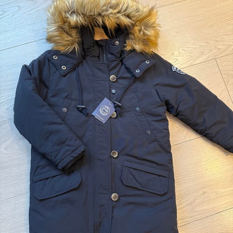 Fint brukt Svea vinterjakke, passer jente 7-8 år. Den er ikke stor i str. Hette med fuskepels, avtagbar hette og pels. Mørkeblå.