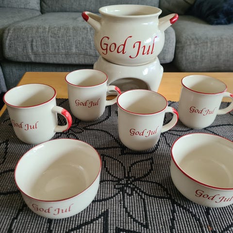 Ubetydelig brukt mugge og skål med påskrift Gløgg og russin- på svensk.