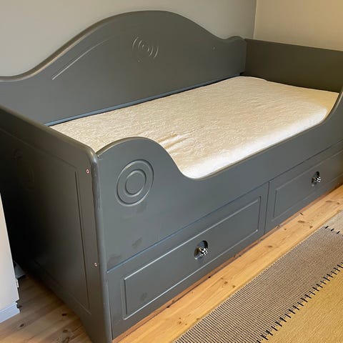 Sortmalt seng i tre selges. Trenger et nytt malingstrøk. To skuffer på hjul følger med.