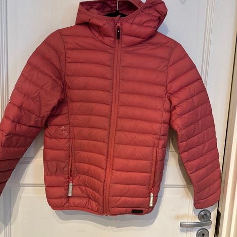 Selger en dunjakke fra Jotunheim i sterk rødfarge. Har avtagbar hette og skikortlomme på armen.