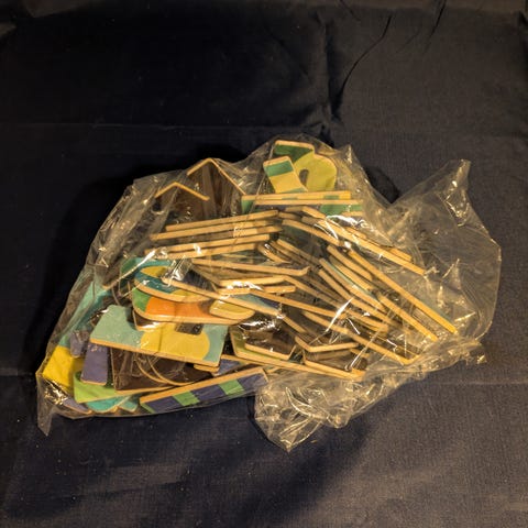 Hver lille brikke har en malt bokstav.