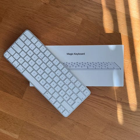 Apple Magic Keyboard i hvit farge, godt brukt, men fortsatt i god stand. Dette tastaturet er kjent for sin elegante design og pålitelighet, og er et flott tillegg til enhver Apple-enhet.