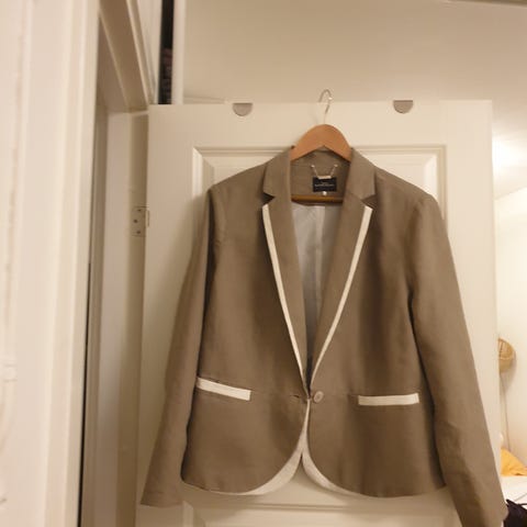 Stoff med litt struktur. 98 % polyester, 2 % elastan.