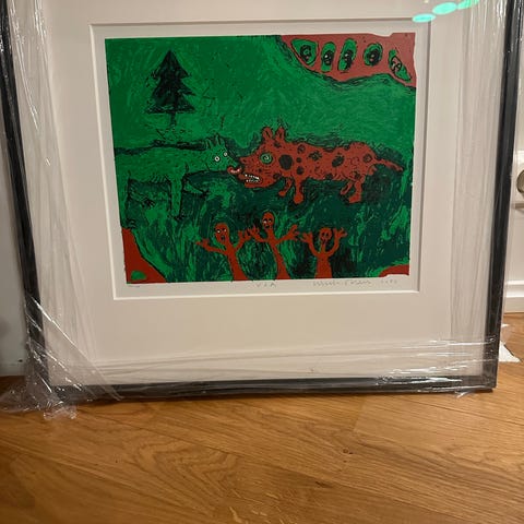 Her har Farmen brukt en blanding av maling og tegning med tørre og bløte stifter. Profesjonelt satt i ramme med glass (derav noe refleks på bildene).