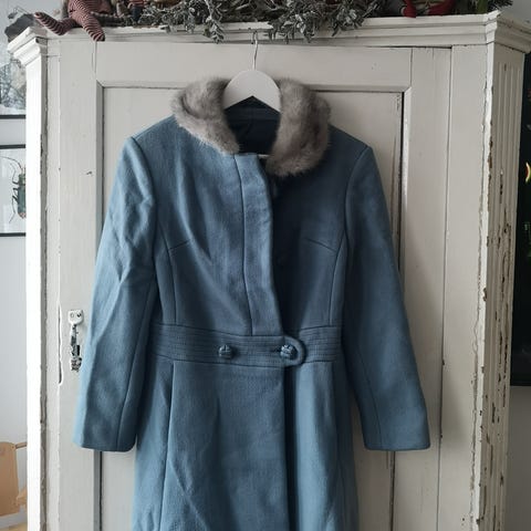 Vintage kåpe med ukjent tekstil. Den har to gode lommer festes med knapper nedover brystet. Kåpen har fint innsving ved livet og en klassisk silhuett.