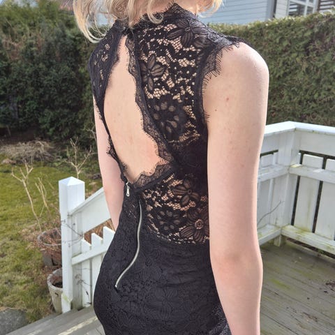 Minikjole i blonder som er gjennomsiktig øverst både foran og bak (dyp rygg, se bildene), med stroppeløs fastsydd underkjole. Modellen heter Marissa S.