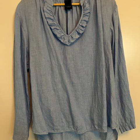 Selger pent brukt tynn og luftig bluse i 100 % bomull. Hvit med tynne lyseblå striper, og dekorfelt på brystpartiet.