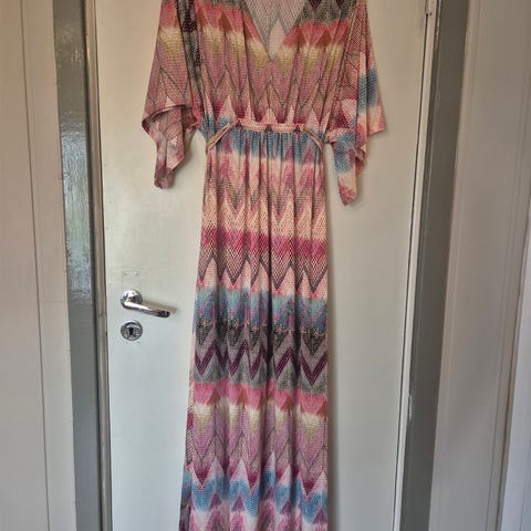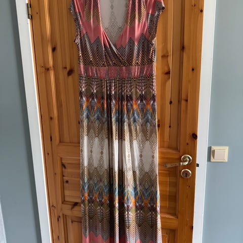 Maxikjole i 92 % polyester og 8 % elastan. Knyting i midjen. Det står XS på, men den passer en stor M—L.