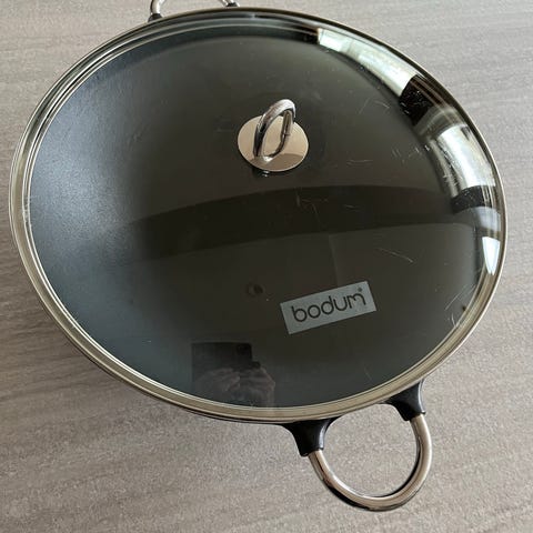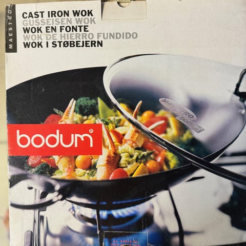 Bodum flatbunn 14" støpejern wok stekepanne - veldig tung. Brukt 1 gang. Bare blitt stående.