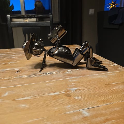 Med tung hjerte selger to vinflaske holder. Selger pga flytting til mindre leilighet og har ikke plass lenger. Disse kjøpt jeg i Spania da var på ferie 5 år siden. Jeg har vært på en kunstutstilling av lokale kunstnere i Jerez og kjøpte disse. De er håndlaget av metal av Francisco Naranjo. Han en lokal kunster fra Jerez de la Frontera (Cadiz).
