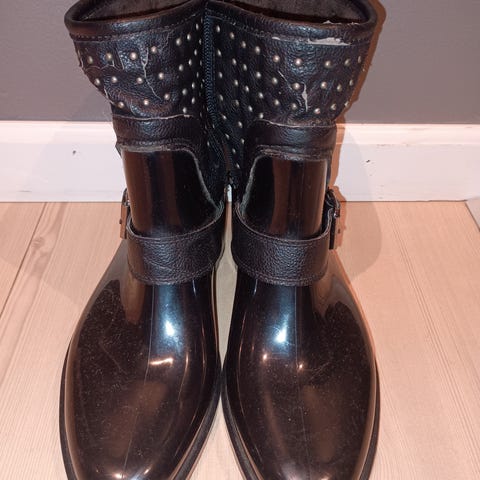 Kule gummistøvler/regnstøvler fra det svenske merket WILDFLOWER i str. 30 selges. Tøffe detaljer! Svart farge som passer til alt. Kun vært brukt et par ganger, fremstår som NYE. Uten ekte emballasje. Kjøpte i Stockholm. Ordinær pris er kr 700. Har helt nye i str. 31.