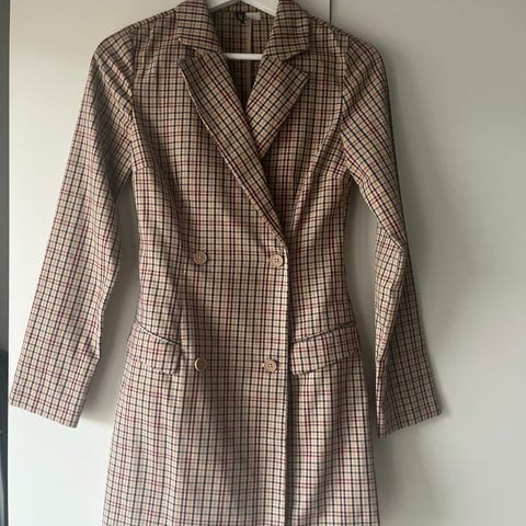 Den er ankellang (170 cm høy person). Lommer i sidene og belte i livet. Foret i overdelen.
