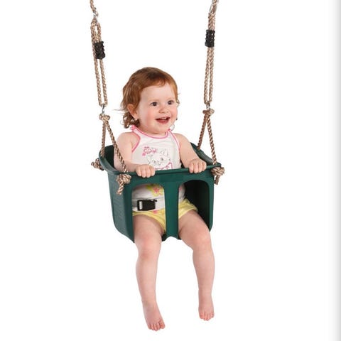 Fin babyhuske av tre med nylontau og treperler og god støtte i ryggen. Så godt som ny! En herlig gaveidé til den lille som har lært å sitte selv og elsker hvordan en gyngetur kiler i magen.