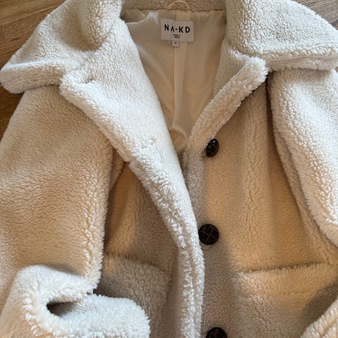 Superfin teddyjakke/boucle-jakke fra NA-KD i str. 32 (xs/small) selges. Stor/oversized i størrelsen, jeg bruker str. M og får den på, men litt liten til å bruke. Fin til både hverdags og fest. Lys beige farge. Tykk og god med to store lommer. Lukkes ned glidelås.