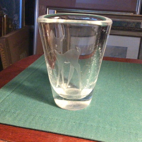 Kr 190 Kunstglassvase Hadeland jaktmotiv signert AJ ( Jutrem)