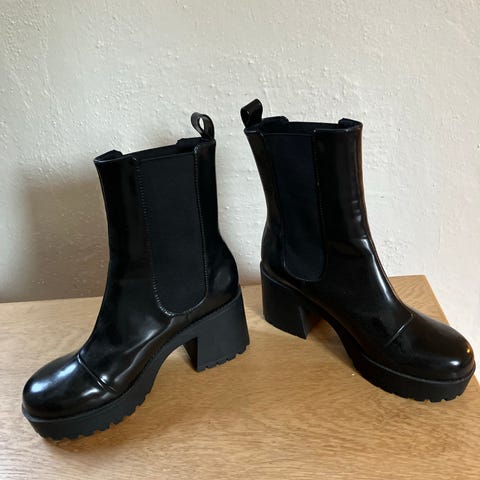 Selger svarte støvletter i størrelse 40. De er komfortable og behagelige å gå med. Det er en liten skrapemerke på skoen, som kan sees på bildet.