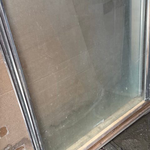 NY PRIS. Dusjdør med metallhåndtak, av god kvalitet. Den har bredde 96 cm. (Dusjdører, glass og stål, 1 stk, Den måler 96x 195. Den er demontert og vasket og står i boden. ( derfor litt vanskelig å ta gode bilder). Den kan hentes i Halden.
