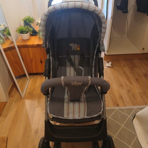 Vognen er en fint brukt kombivogn i en mørk grå farge. Den er kjempebehagelig å bruke, enkel å slå sammen og har svingbare hjul.