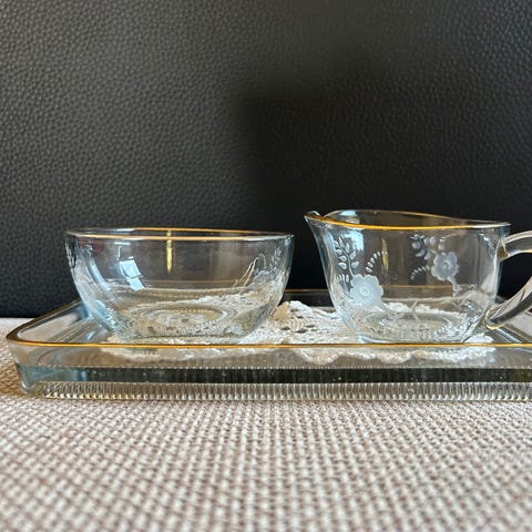 Gammelt søtt fløte- og sukkersett på fat selges kr 300. Fatet har bruksmerker.