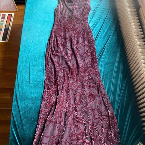 Kjole i burgunder nervøs fløyel, ermer med splitt og knyttebånd, fasongen er lett utskrådt A-fasong, med knyttebelte i samme stoff til å knytte i livet, lengde bak 120cm.