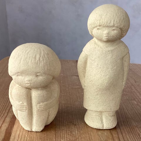 Søte figurer i sandstein. Usikker på om den store syngende gutten er av merket Marbell, den er også noe gulere i fargen.