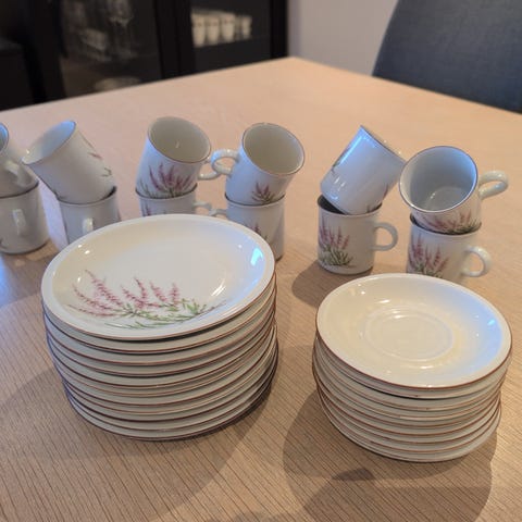Kaffeserviset er av merket Winterling Bavaria og består av 10 kopper 10 asjetter 10 tefat, samt fløtemugge