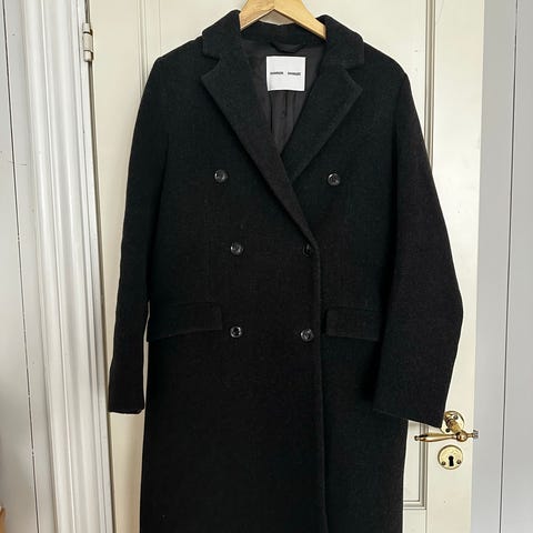 Design: Lang, dobbeltspent frakk med to knapper foran. Har en klassisk krage og sidelommer.