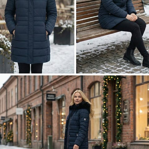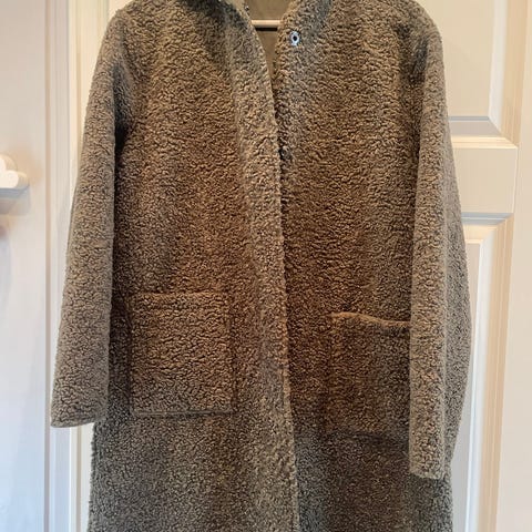 Forseggjort dunkåpe m/fuskepels i nydelig grønnfarge. Kåpen har høy krage, innsnøring i livet, tilpassing av ermene og fine detaljer på lommene. Fuskepelsen kan tas av.