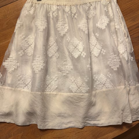 Eggeskallet blondeskjørt med rødbrunt silkestoff under.