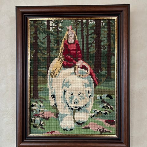 Nydelig vintage broderi i ramme og glass. Profesjonelt innrammet.