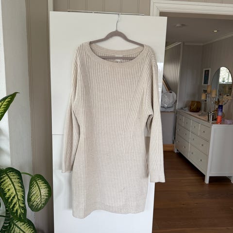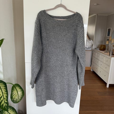Helt ny strikkekjole. Kan også brukes som lang genser. Inneholder ull, viskose, alpaka og akryl.