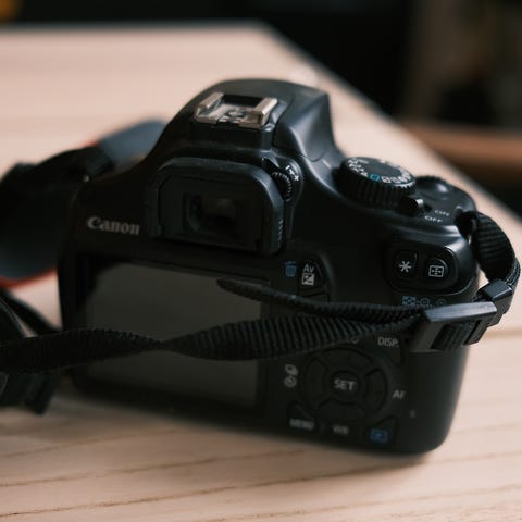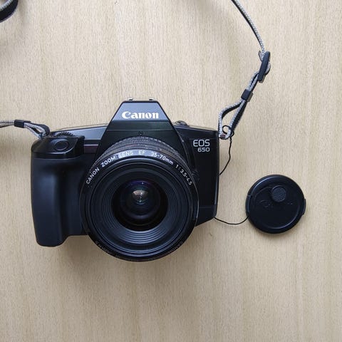 Canon EOS650, som er godt brukt. Mangler øyemusling bak, ellers i bra stand.
