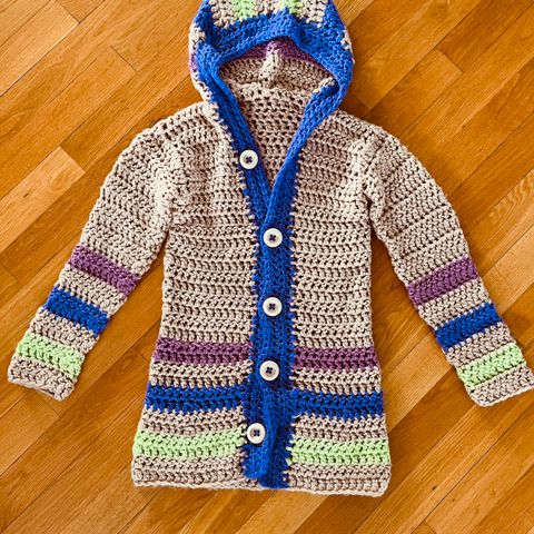 Et tråd har blitt dratt litt på den rosa genser, dette kan lett fikses med heklenål feks, se bilde