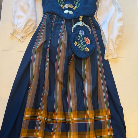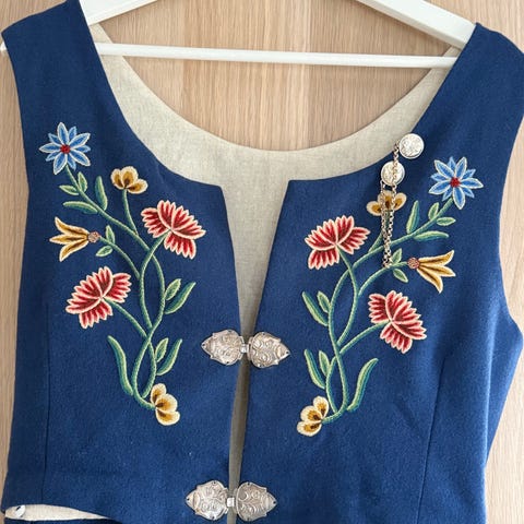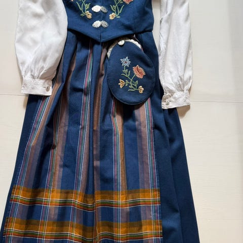 Pent brukt og komplett Nordlandsbunad selges med liv, stakk, veske, skjorte, sjal og forkle. laget av en erfaren skredder. bunaden er lite brukt, fremstår som ny. Nydelige broderier på vest, stakk og veske i beste ull kvalitet, og skjorte i lin. Bunaden kan sys inn/ut. Alt tilbehøret, veskelås og 2 par sølvspenner på vesten inkludert i prisen 23200. stor og liten halsølje til skjorta og mansjettknapper kan kjøpes for kr. 5700. De er nye og fra Gullsmed Rørvik. Bunaden kan prøves eller sendes. Ta kontakt for mer informasjon eller for å avtale visning.
