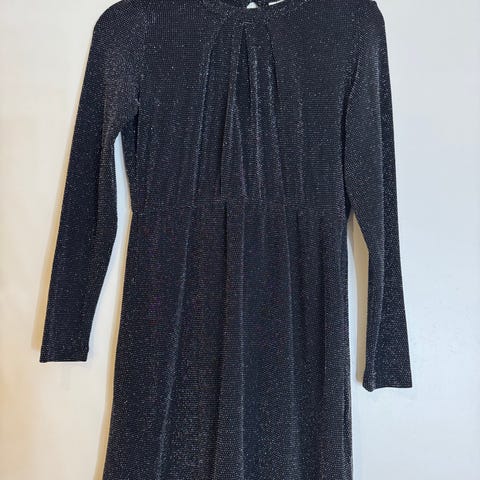 Nydelig kort mintfarget kjole. Kan passe fra ca str 128 pga strikk i sidene. Åpnes med glidelås bak. Fine detaljer med paljetter fremme. Full snurr på skjørtet for de som liker det 💃