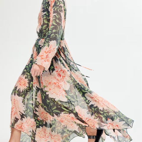 Str. XS lengde foran 123 cm. Bredde fra armhule til armhule 46 cm x 2, midje 39 cm x 2. Underkjøle: Bredde fra armhule til armhule 46 cm x 2, midje 39 cm x 2, lengde 100 cm. Silke, fine farger.