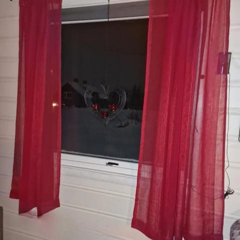 Selger mine nydelige julerøde gardiner. De har en varm julete rødfarge. Laget av polyester og kjøpt på Princess. Lett transparent stoff som faller fint. Noen er brukt og skylt opp, men de fleste har aldri vært hengt opp. Brukt på Rjukan (6 mnd uten sol) , så ingen solbleking og ulik farge. De som er helt ubrukte er litt stive i stoffet, så de må skylles opp/strykes.