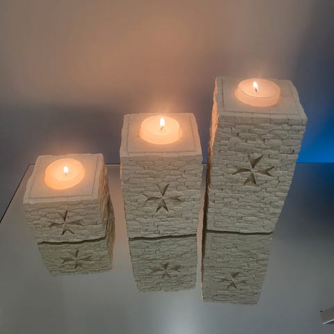 Høyde 4 cm, diameter 7 cm. Hull til lys ca 1 cm diameter.