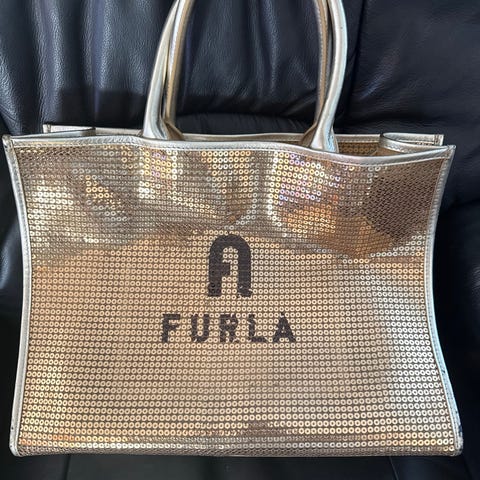 Svært lite brukt. Skinn furla veske. Litt bleket på den ene siden pga hengt i sollys som vist på et bilde.. Ingen slitte merker.