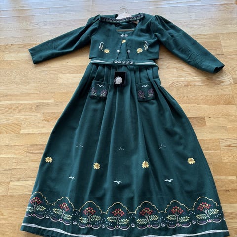 Fin kjole i størrelse 34 som tilsvarer XS’ selges for 300 kr, kjøpt i utlandet lit liten i størrelse kan passe til jente 10-11-12 år, brukt 1 gang til 17 mai da det matcher veldig godt med den dagen 😊sendes ikke eller leveres ikke,må hentes selv fra Kopervik.