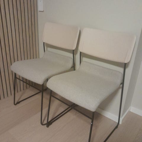 Spisestue-stoler med armlener. Selger 8 brukte Totem-stoler med høy rygg designet av Torstein Nilsen. 3500,- kr for alle åtte eller 500,- per stol.
