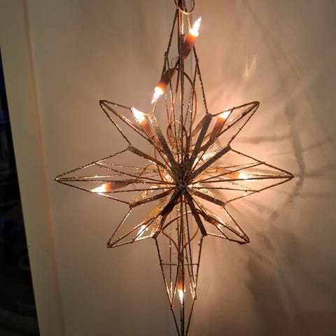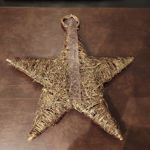 Julestjerne som ser ut til å være laget av bl.a trepinner og vatt i grå og hvit farge.