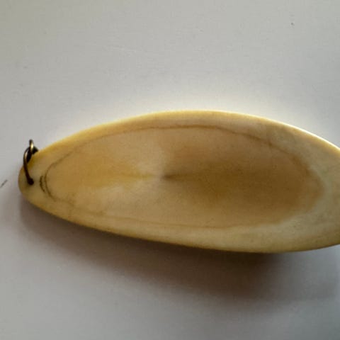 Sjelden og fin nål håndlaget i tre hvor ulike treslag er limt sammen og bearbeidet til en fin rund form med spiss i den ene enden. Nål på baksiden til feste. Lengde: 4,5 cm, bredde: 2 cm. Ingen har maken.