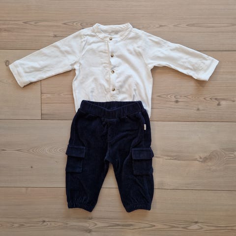 Fint og pent brukt sett med en tøff NoaNoa skjorte body og blå Hust & Claire penbukse i størrelse 56 cm, 1 mnd, nyfødt.