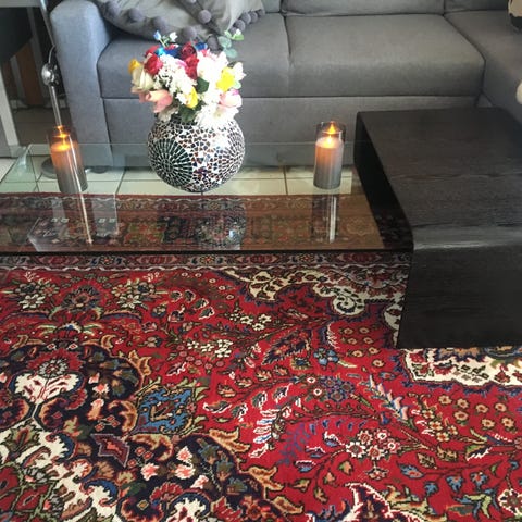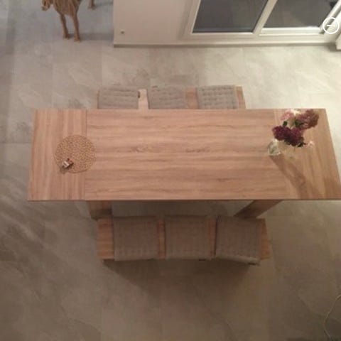 Understell i tre, høyde 48 på bordet. Bordplater i flott design laget av kunstdesigner i pleksiglass. Platene er 92x92 cm og legges på toppen av bordet. Helt unikt, finnes kun denne utgaven. Designplatene kan også brukes som bilde på veggen. Jeg har hatt den ene stående på toppen av en skjenk inn mot veggen. Superlekre bilder.