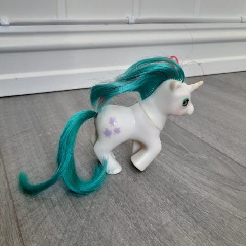 Veldig søt skjelden baby candy🍬🍬 vurderes solgt HBO SERIØSE BUD TAKK 🩷ponnyen er fra 80 tallet og er vintage, meget skjelden å få tak i, Selges som vist på bildene bruksmerker og slitasje på hår kan forekomme da det har vært lekt med en gang i tiden, SERIØSE BUD OG HENVENDELSER TAKK