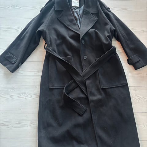 Selger lang uforet kåpe fra Object. Svart. Str 52. Belte i midjen. Lommer i siden. Mykt stoff, 70% polyester, 30% ull.