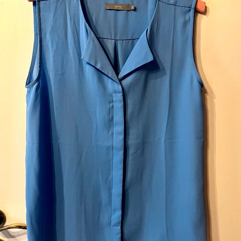 Blå, nesten lilla farget, gjennomsiktig nydelig bluse/topp med små sølvperler på kragen.