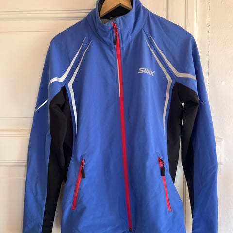 Pent brukt skijakke til dame selges. Jakken har en blå fremside med hvite, sorte og rosa detaljer. Baksiden er hovedsakelig sort med noen hvite markeringer. Refleks på armene.
